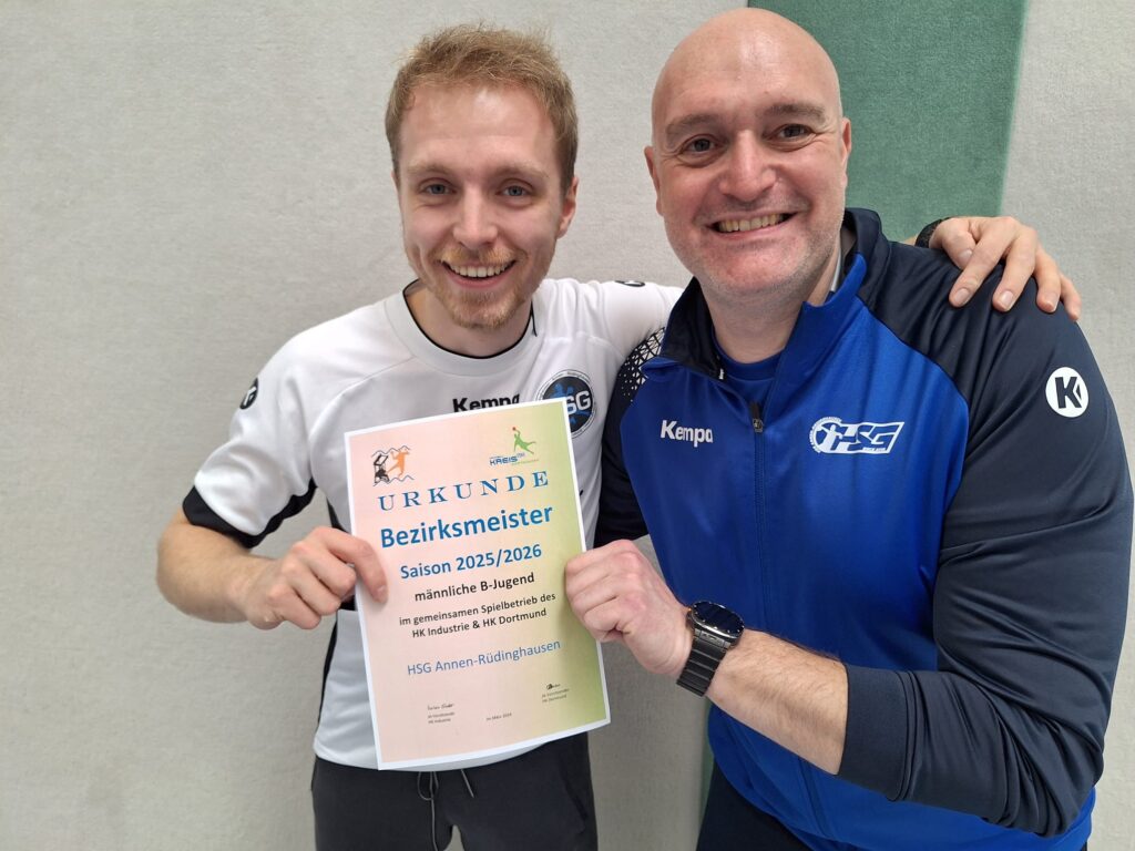 Witten, 15.03.2026 – Ein torreiches und spektakuläres Spiel bildete den perfekten Abschluss einer außergewöhnlichen Saison für die männliche B-Jugend der HSG Annen-Rüdinghausen. Vor rund 50 Zuschauern setzte sich die HSG im letzten Saisonspiel der Bezirksliga mit 44:36 (20:21) gegen die HSG DJK Rauxel-Schwerin durch und feierte anschließend ausgelassen die verdiente Bezirksmeisterschaft.
